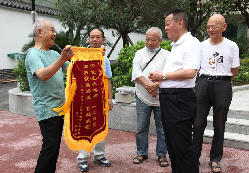 9月6日,住在南充开放大学宿舍区的全体居民,给南充开大党委送来一面书写着“学党史办实事一心为民、治脏乱美环境百姓点赞”的锦旗,为南充开大党委学党史悟思想,办实事解民忧的事迹表达由衷的感谢。