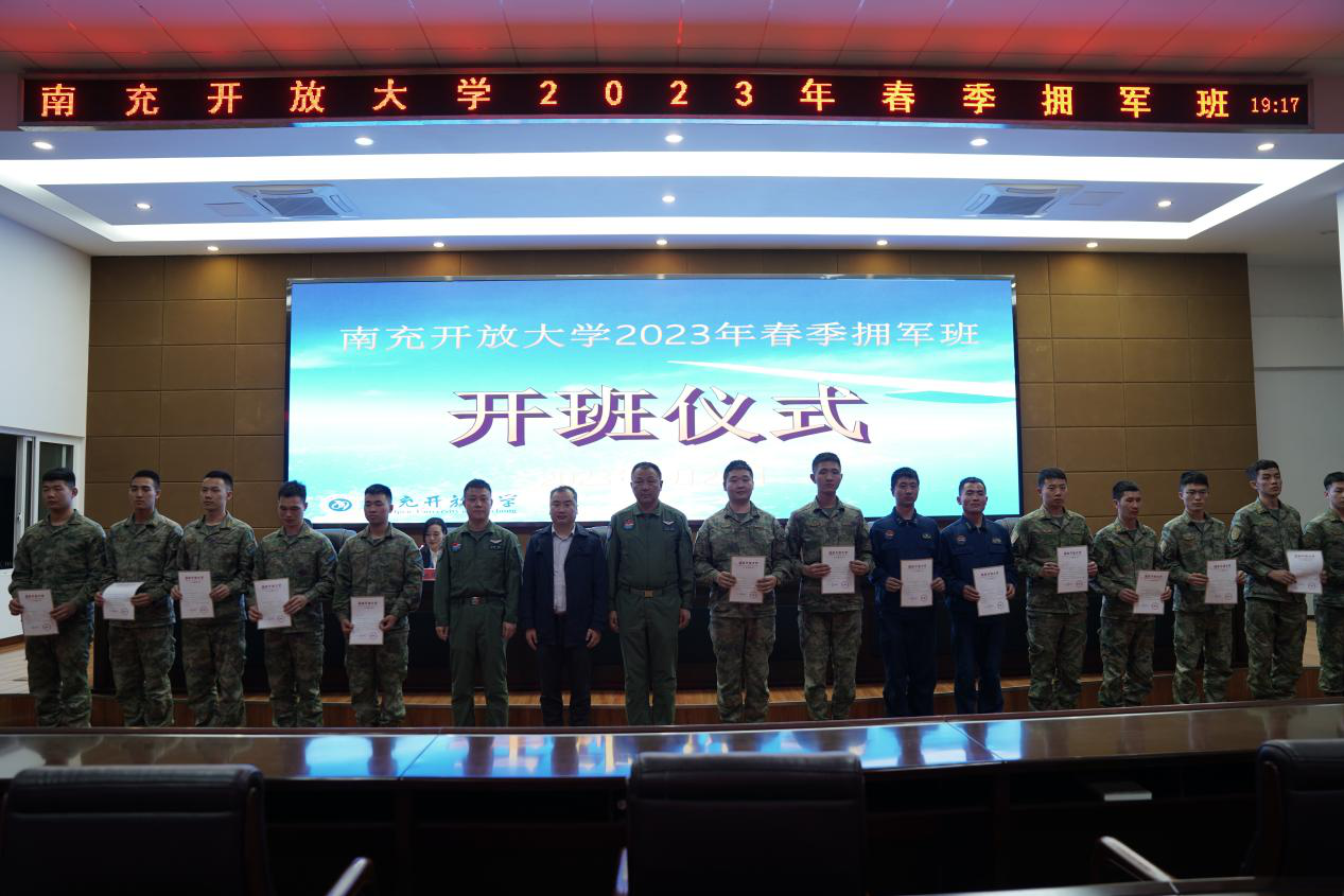 4月26日晚,南充开放大学2023年春季“拥军班”开班仪式在南充某部队学术厅举行。某部队副部队长王刚、副参谋长秦斌和南充开放大学副校长曲阳出席开班仪式。