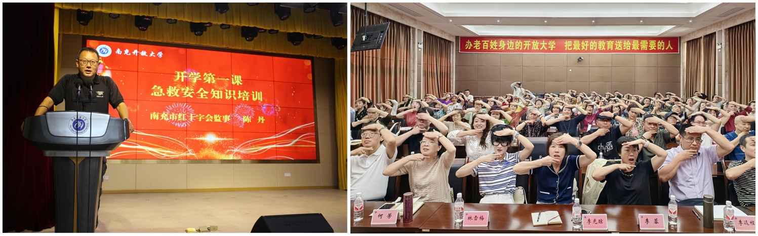 本次开学典礼特别设置“开学第一课”环节,邀请南充市红十字会监事陈丹老师开展急救安全知识培训。他通过理论讲解、案例分析和现场演示相结合的方式,讲授心肺复苏等实用急救技能,并现场互动答疑,有效提升了老年学员的自我保护与应急处置能力。