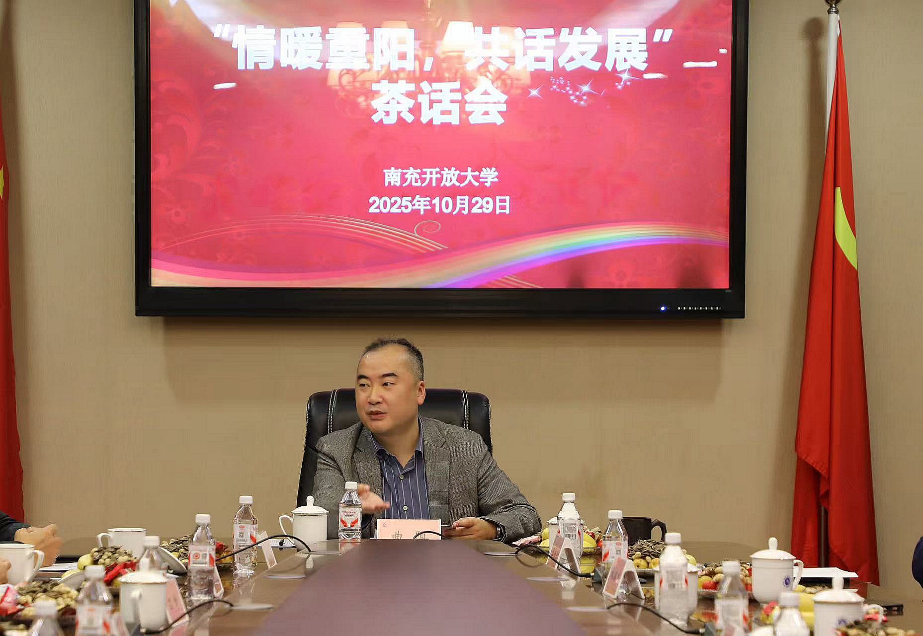 2025年10月29日,南充开放大学“情暖重阳,共话发展” 重阳节茶话会在温馨祥和的氛围中如期举行。数十名退休老同志欢聚一堂,共庆重阳佳节,同叙往昔情谊,共话学校发展。学校党委副书记、校长曲阳出席会议并讲话,党委副书记王嘉敏主持会议。