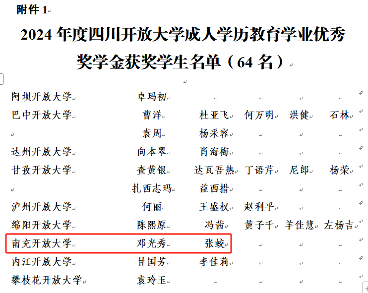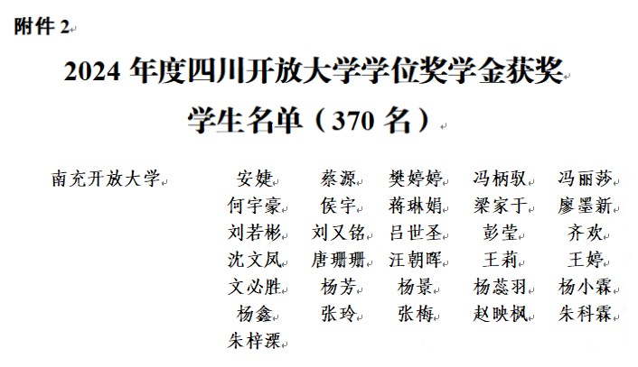 近日,四川开放大学印发了《关于表彰2024年度专项奖学金获奖学生的通知》(川开大校招[2025]34号)文件,我校邓光秀、张蛟获得2024年度四川开放大学成人学历教育学业优秀奖学金;安婕等31名学生被授予2024年度四川开放大学学位奖学金。值得关注的是,此次所有获奖学生均已顺利通过国家开放大学学位申请审核,成功拿到了学位证书。