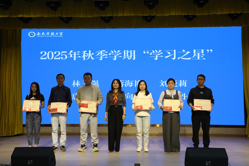 16时,开学典礼环节于学校多功能会议厅隆重启幕。会场播放了国家开放大学专题片,宣读并表彰了南充开放大学2025年秋季网上学习之星、2025年度奖学金获得者。学校领导为获评学生代表颁发荣誉证书。