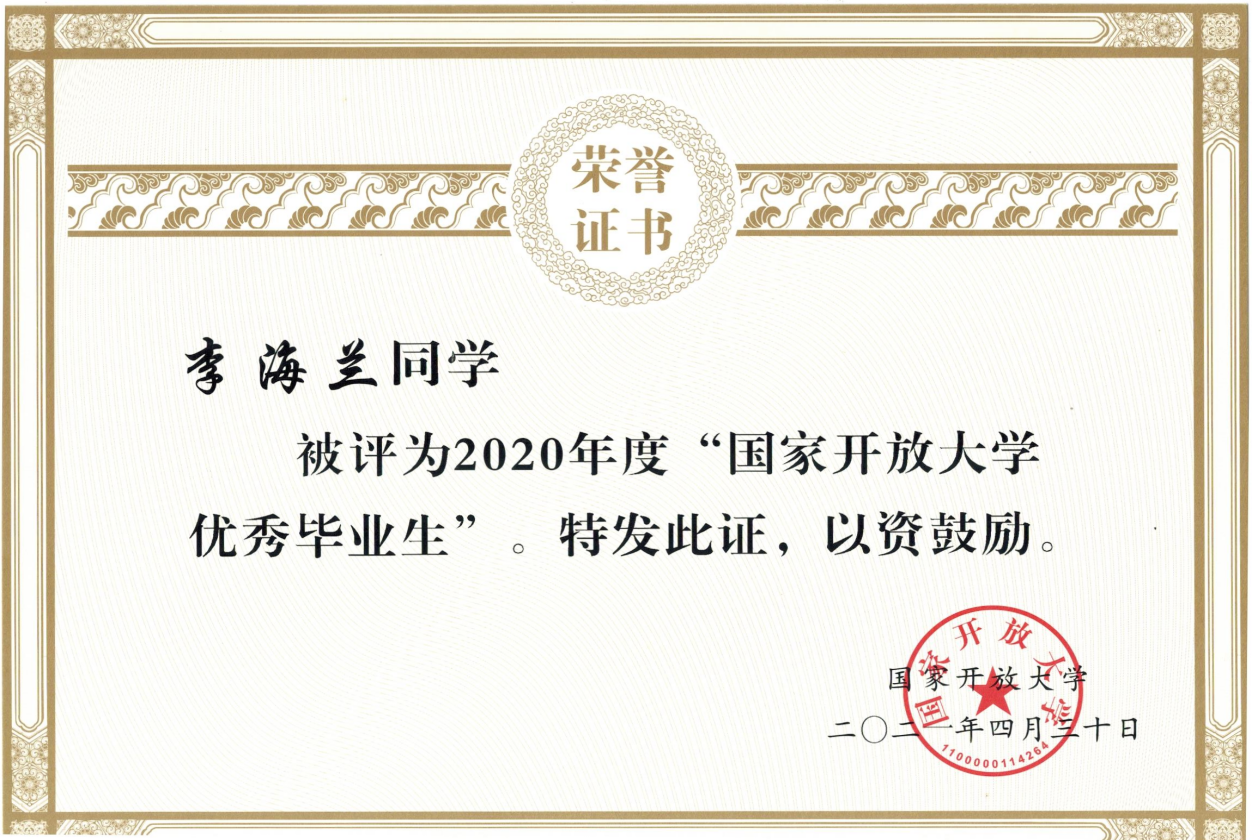 李海兰被国家开放大学评为优秀毕业生