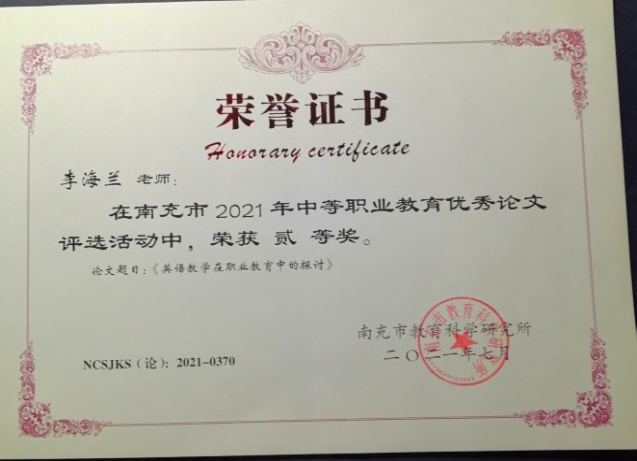 她是南充外国语中等专业学校的一名教师,平常教学任务非常繁重,但是她始终以饱满的热情投入工作。2018年她被评为校优秀教师,2019年获得南充市中等职业学校教师教学能力比赛叁等奖,2021年在南充市中等职业学校优秀论文评选活动中,荣获贰等奖。