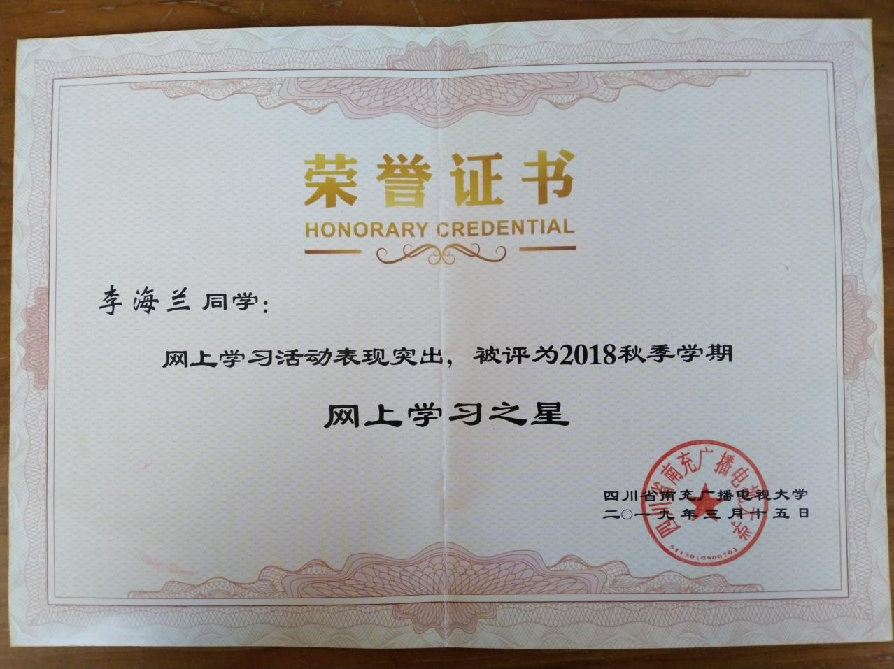2018年9月李海兰荣获网上学习之星