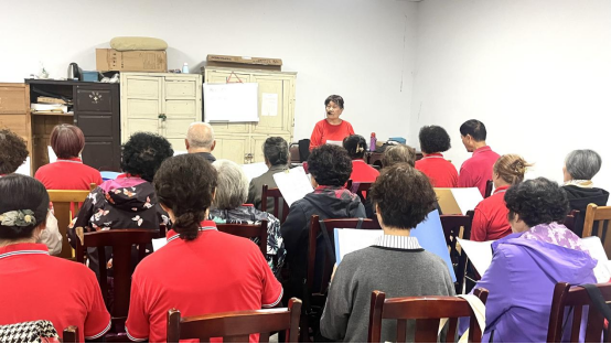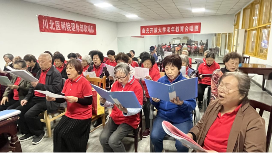 每周五下午,川北医学院附属医院职工宿舍楼里,不时会传来悠扬悦耳的歌声。我校社区教育志愿者、具有专业音乐素养的杨延蓉老师,正在耐心为学员们授课。学员们齐聚一堂练声、试唱,享受着歌声带来的愉悦快乐。在这里,练歌合唱之余,大家也唠家常、交朋友,纷纷表示通过活动获得了自我认同感,提升了晚年生活的幸福指数,教室里的气氛温馨而美好。