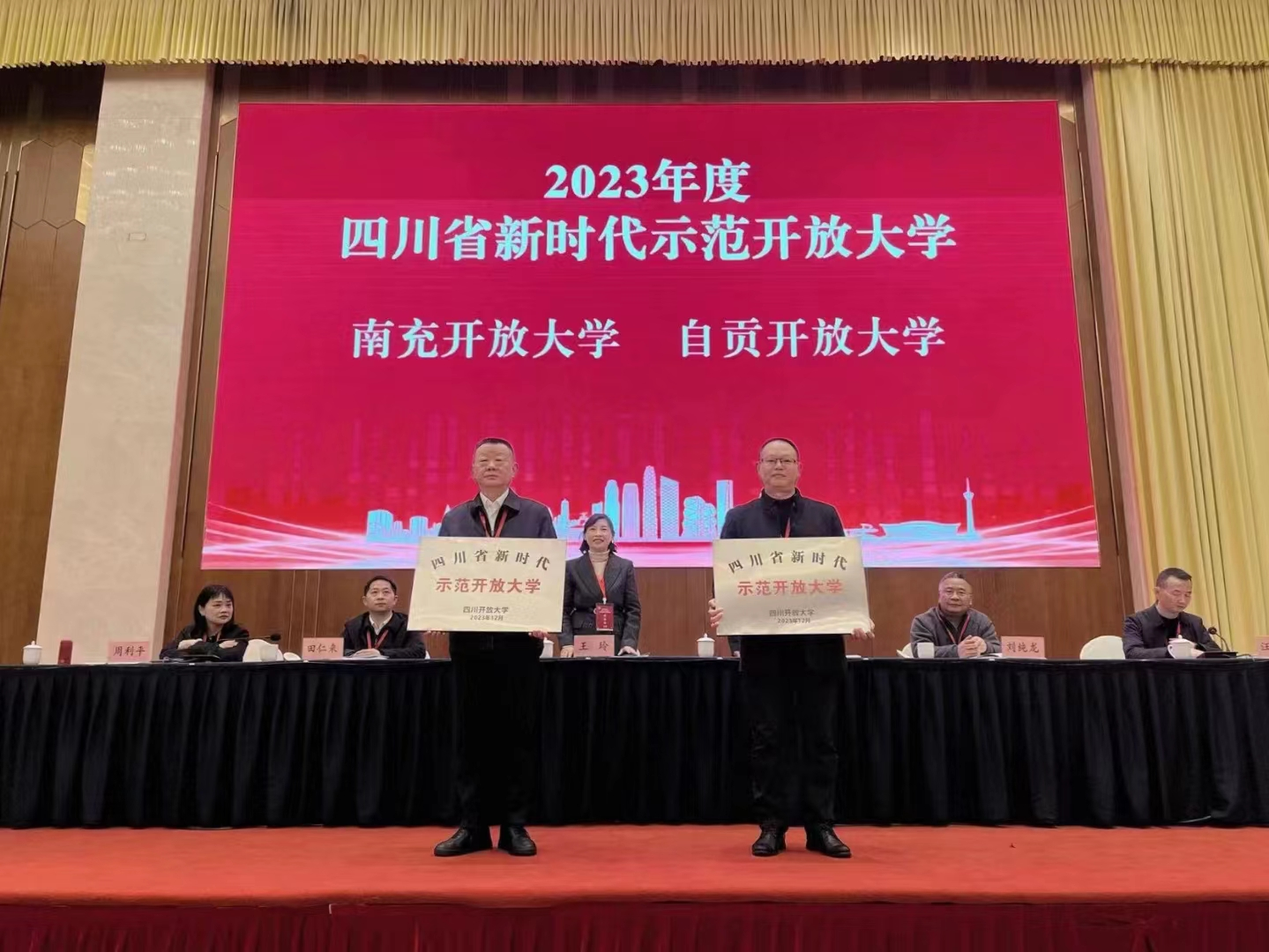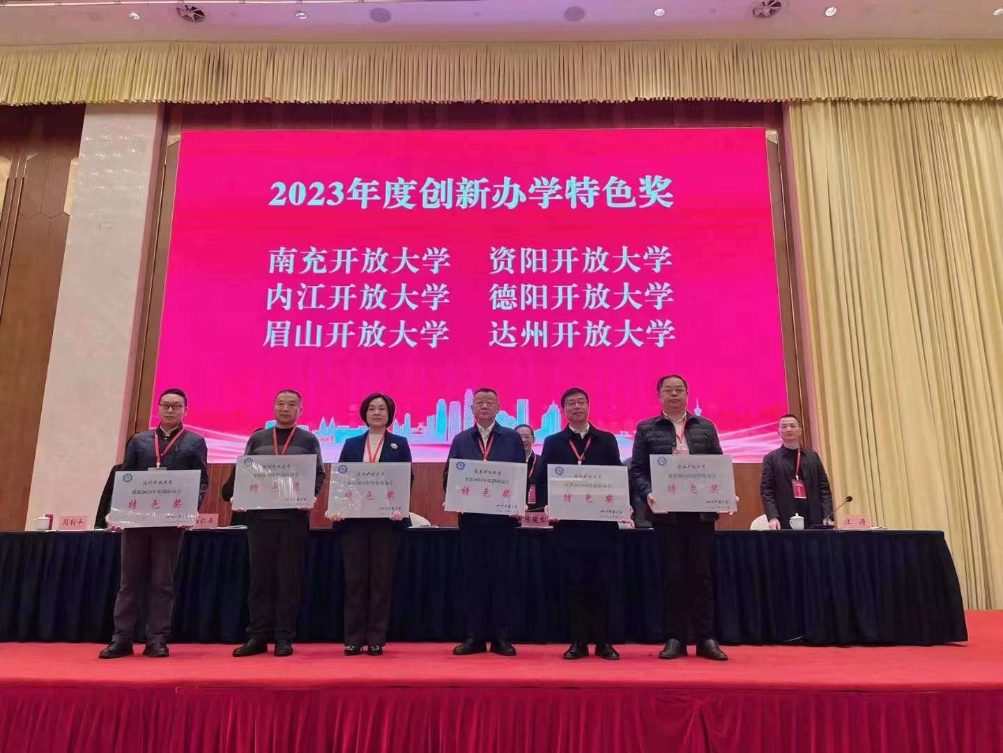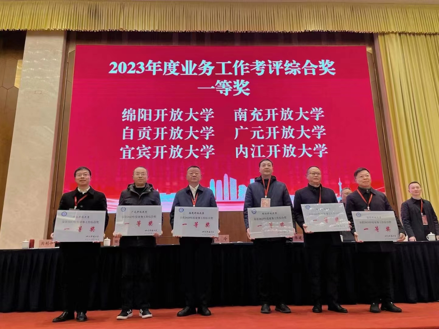 南充开放大学党委书记、校长昝平四上“奖”台,先后领取“2023年度业务工作考评综合奖一等奖”、“2023年度创新办学特色奖”、“2023年度四川省新时代示范开放大学”、“2023年办学评估突出贡献单位”等四“块”沉甸甸的奖牌。