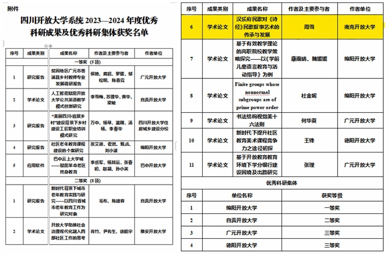 为充分调动全省开大系统教职工参与科研工作的积极性,加强科研成果的推广、交流和应用,展示全省开大系统科学研究的成果,根据《四川开放大学系统科研工作指导意见》(川大校科〔2015〕10号)规定,四川开放大学开展了2023-2024年度优秀科研成果与优秀科研集体评选工作。我校周雪老师撰写的学术论文《汉乐府民歌对〈《诗经》〉民歌叙事艺术的传承与发展》历经资格审查、专家评审、校学术委员会审议、校长办公会审定等多轮严格筛选,最终荣获优秀科研成果三等奖。
