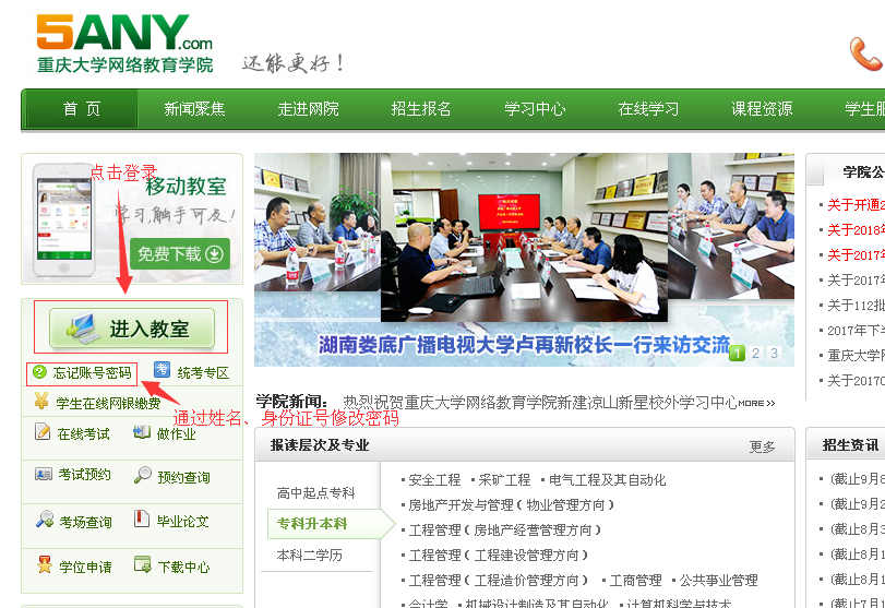 你们被录取后,重大网络教育学院会用短信通知你们学习平台网址、用户名和密码,如果忘记网址可百度"重庆大学网络教育学院"进入下面页面,然后点击"进入教室"选项(如下图红箭头所指示),输入用户名和密码就能进入网络教室了。如果忘记了用户名和密码,可通过点击"忘记账号和密码"选项(下图红箭头所指示)进行查询。