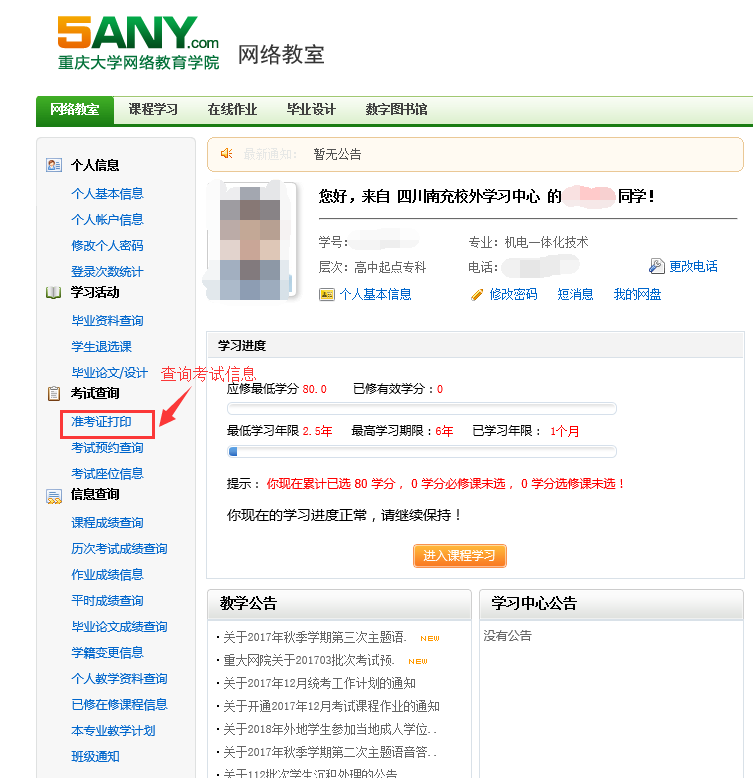 试卷考试前,请你们先打好准考证,准考证上有考试科目、时间、考室 等信息。准考证打印请点击"准考证打印"选项(如下图红箭头所指示的选项)。 考试成绩大致在考试结束一个月后发布。
