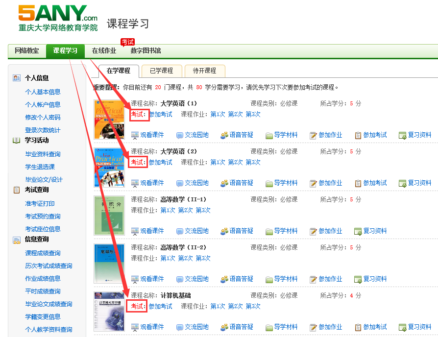 网上考试的课程,在考试规定的时间段内,会在课程名称的下面用红色的"考试"两字标注(如下图红色箭头指示),直接点击"考试"后面的"参加考试"就可进行该门课程的网上考试了。要注意的是,网上考试不能申请重做,考试不及格只能参加下次考试了。