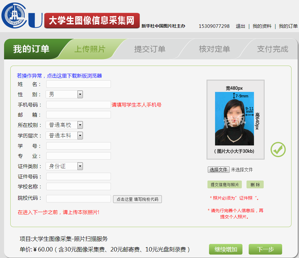 凡是在图像采集期间,不能在学校参加图像采集的同学,可以自己登录“大学生图像信息采集网”上传照片。其方法如下: